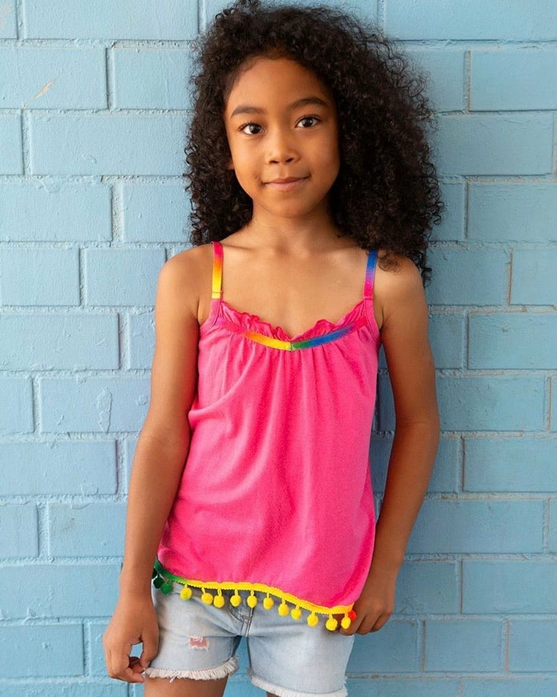 This draped, flowing jersey tank has adjustable rainbow straps, matching pom-pon trim on a wavy hem, and a gathered neckline.