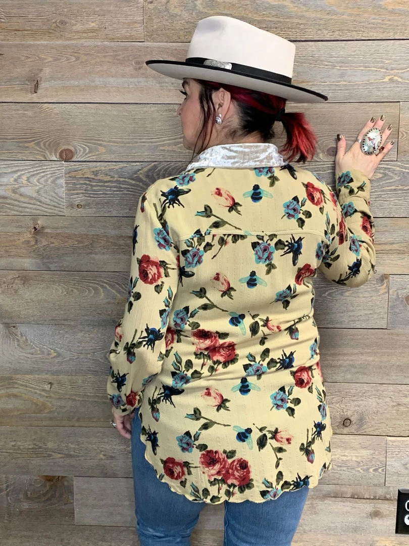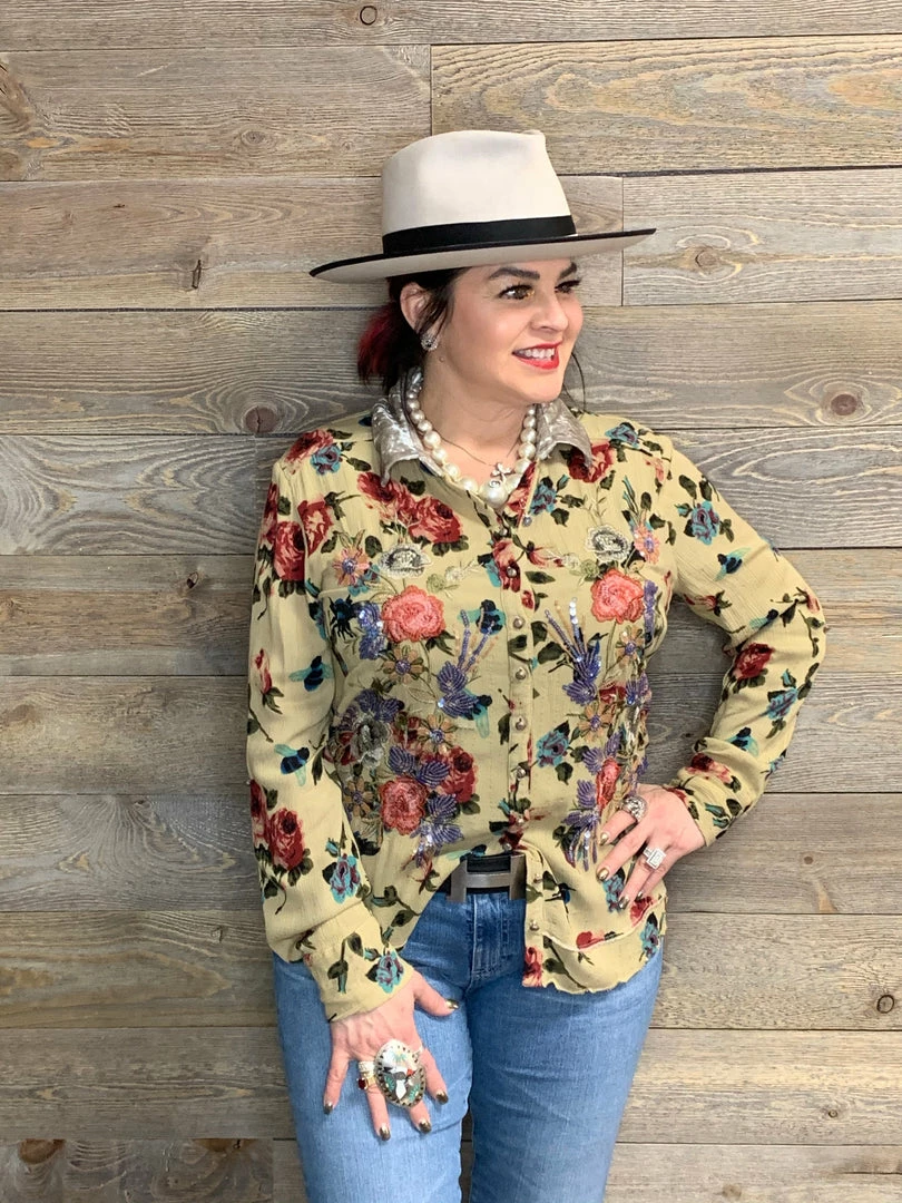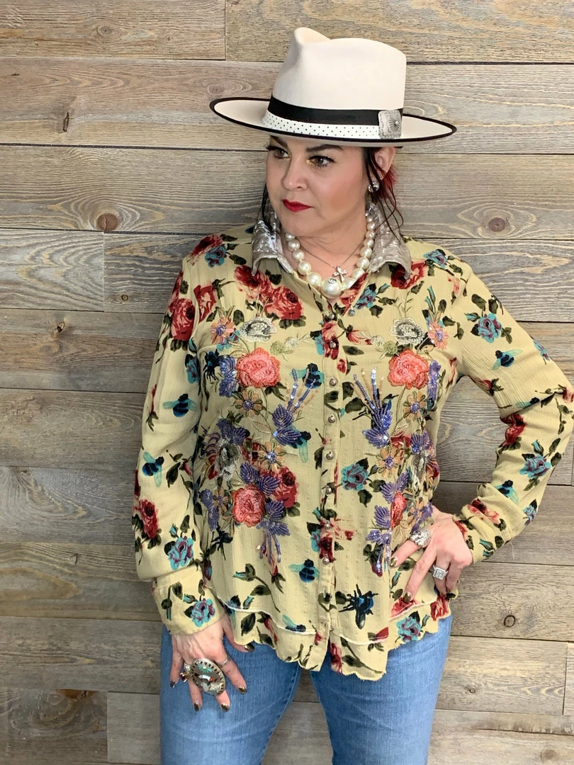 This blouse has feminine all over it! Pretty floral print accented with sequins and embroidery, a velvet collar and scalloped bottom! Dress up or go casual.