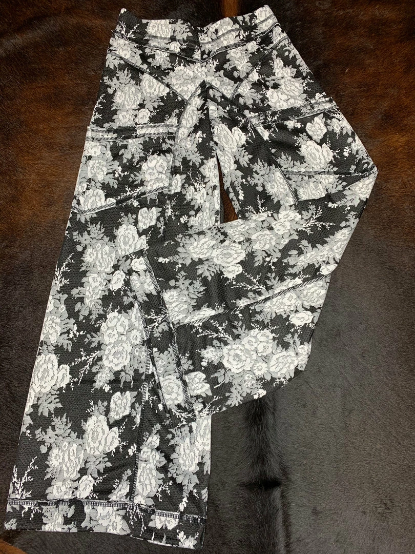 Daphne pant is constructed from a wick away synthetic print, 16 panels serged together then cover stitched in contrasting thread featuring large pockets. ย
