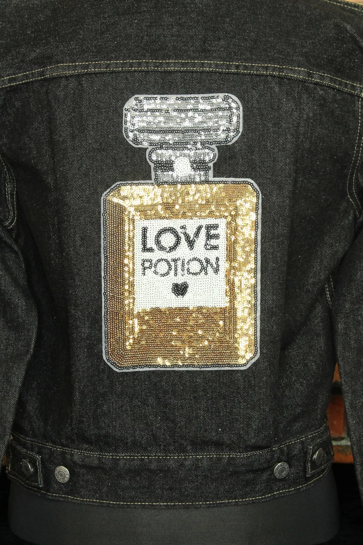 Sequined cherries on the front and sequined Love Potion bottle on the back.