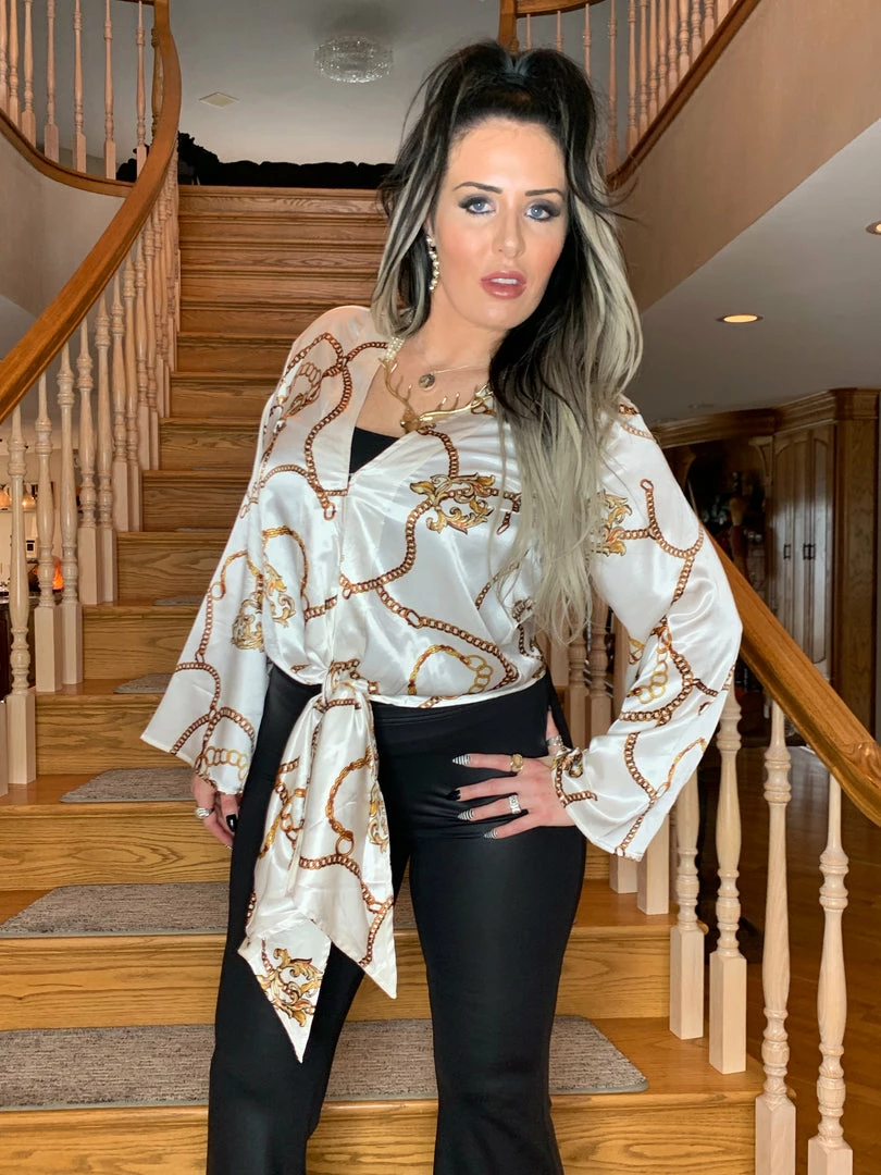 You’ll be weekend ready with our Gayle Top! She features a v-neck, long bell sleeves, tie front and a hook and eye closure in front!