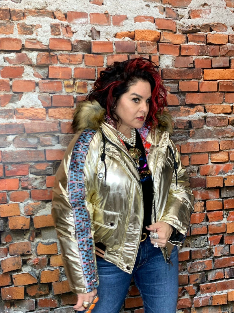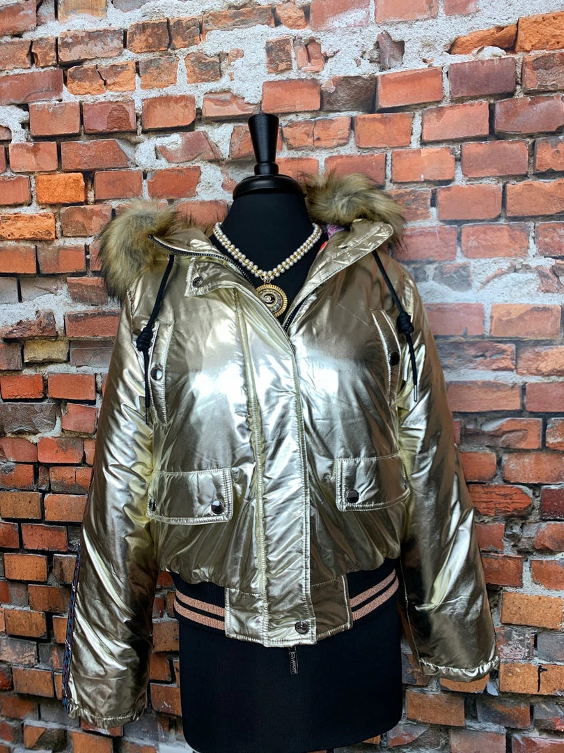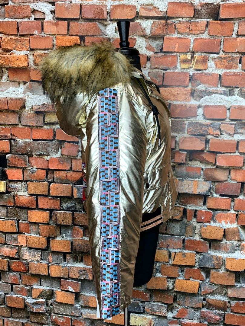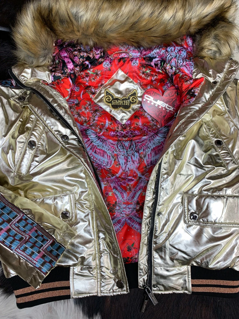Designed in Spain by Custo Barcelona. Shiny gold metallic with beautiful embroidery on sleeve and the back of jacket. Hood with faux fur. The 36 fit me perfect and in US sizing I wear a medium and or a 8/10