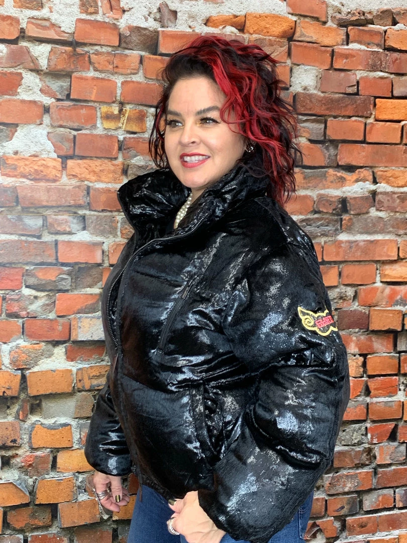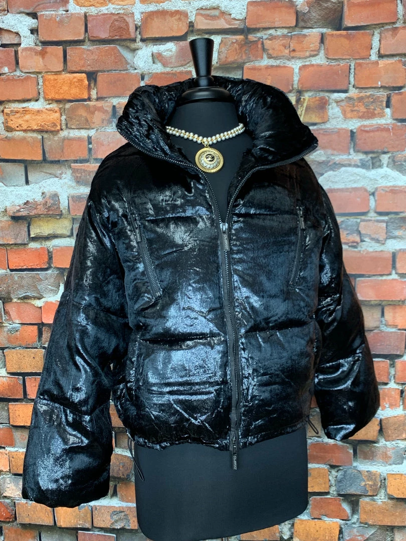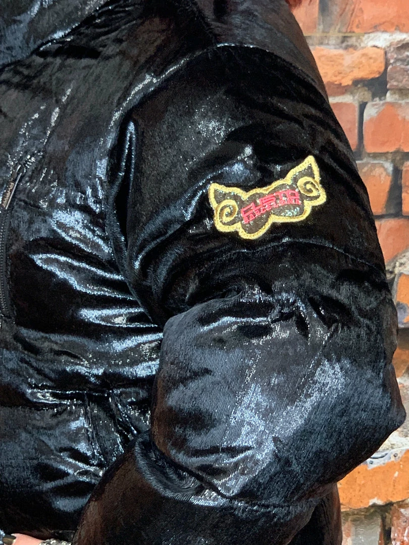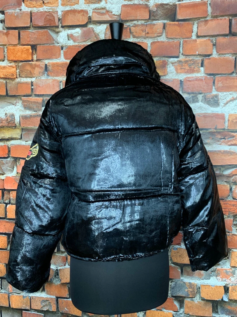 Designed in Spain by Custo Barcelona. Black velvet metallic with embroidered logo on sleeve. Has drawstrings to make jacket a little more snug to body. Small is generous on me
