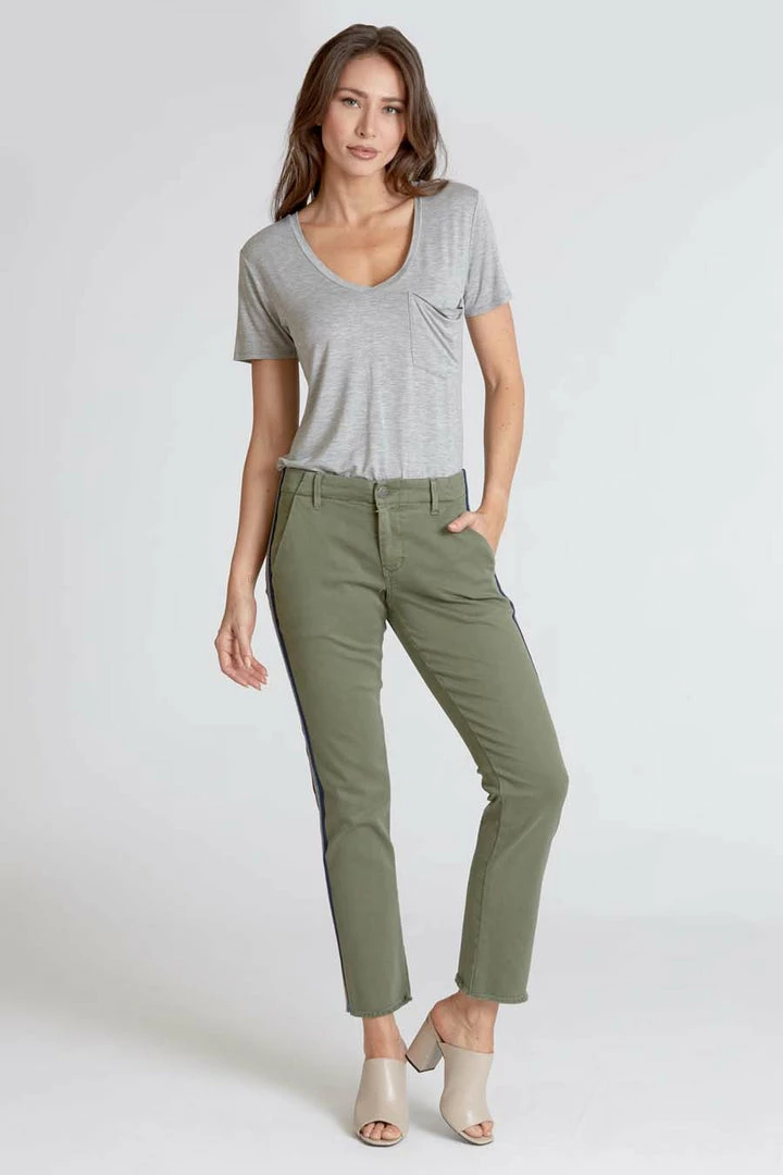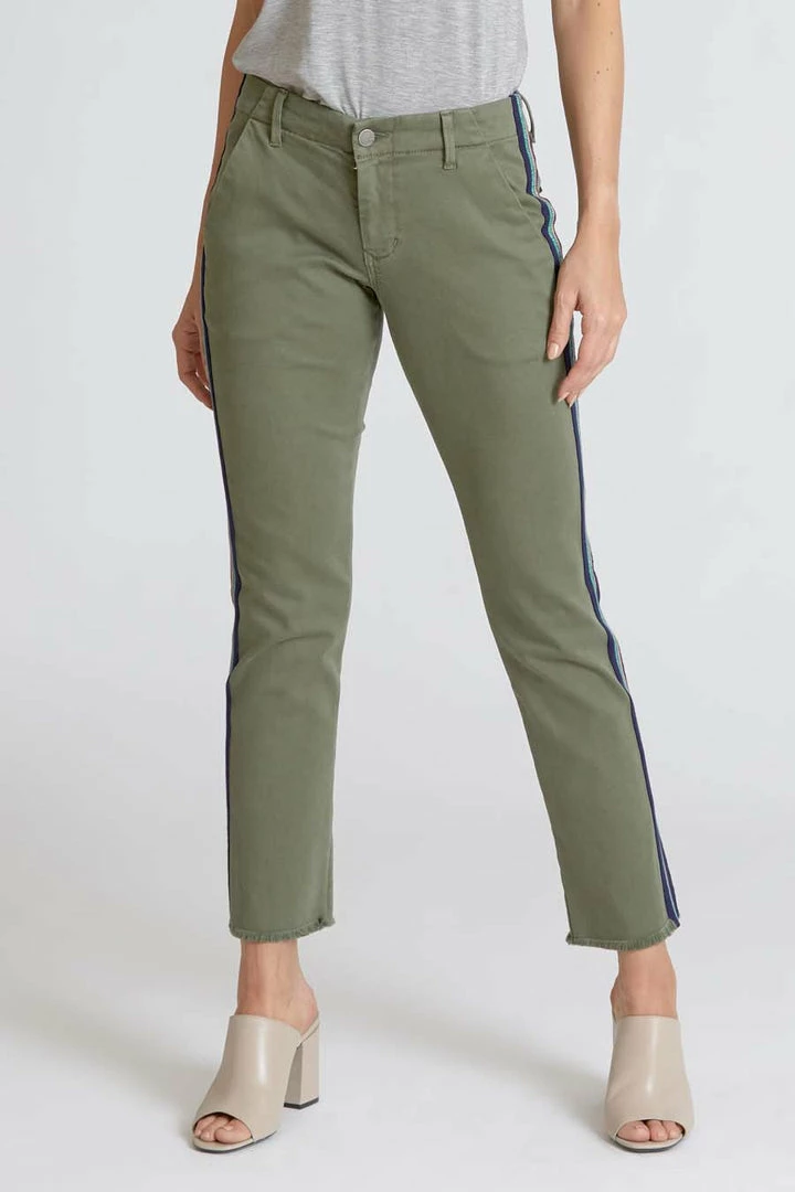 Dear John Blaire pants with fun strips down the side of the leg. Pants are very comfy and sporty cool! Slim straight, High-rise, ankle, side stripe w/back lace up detail.