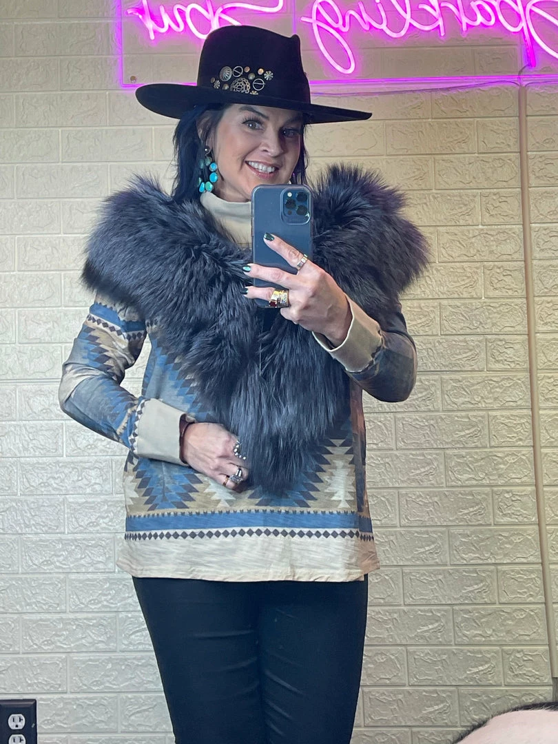 There’s a lot to love about this little number. It’s a lightweight, long-sleeved cotton top that has statement sweater vibes with a bold geometric pattern and a band of deer designs. It has a relaxed fit with a mock-turtleneck and soft shades of warm browns and baby blues that are perfect for the season.