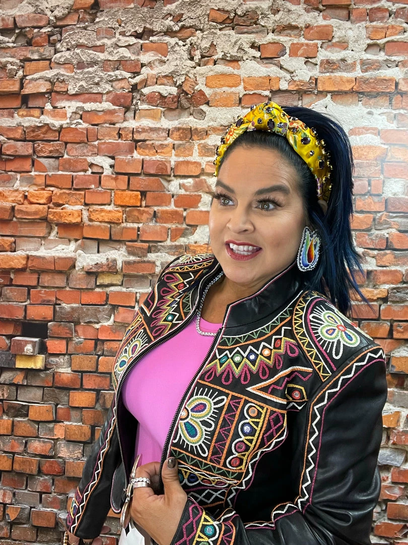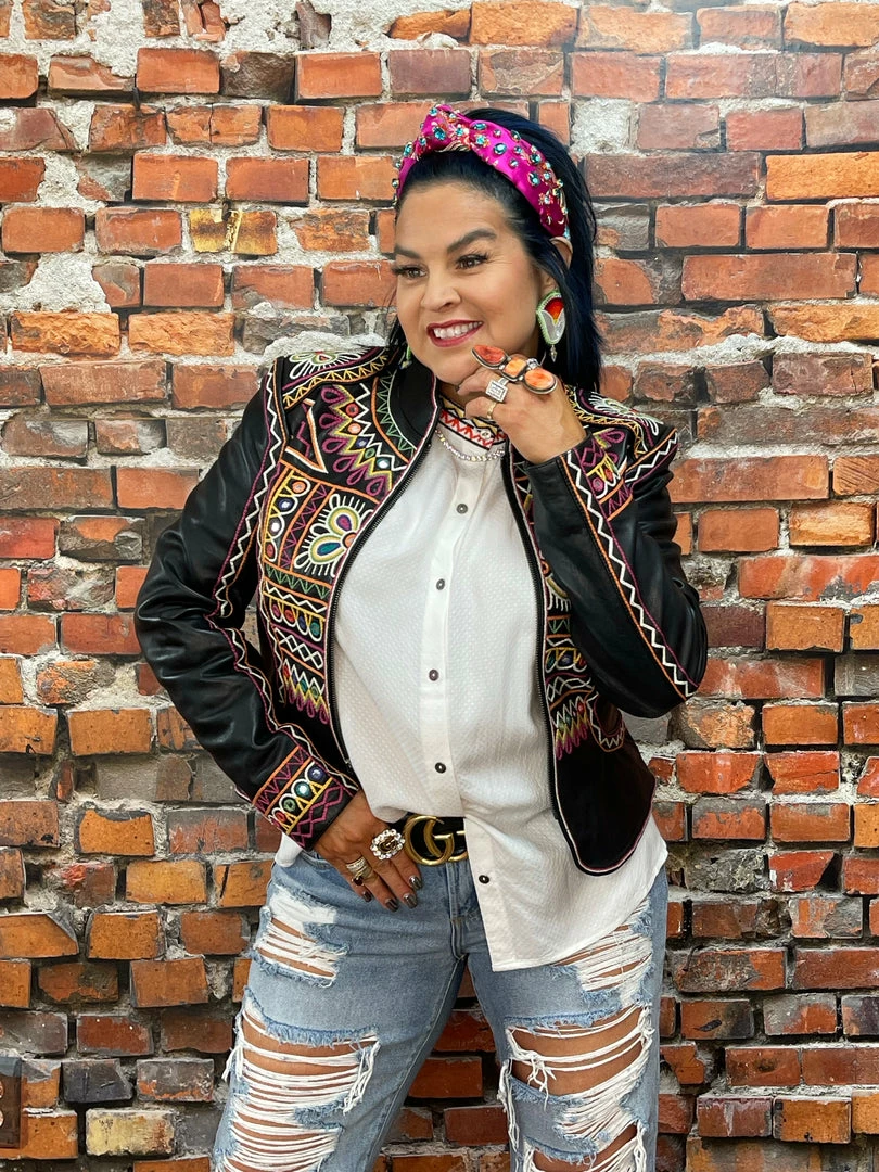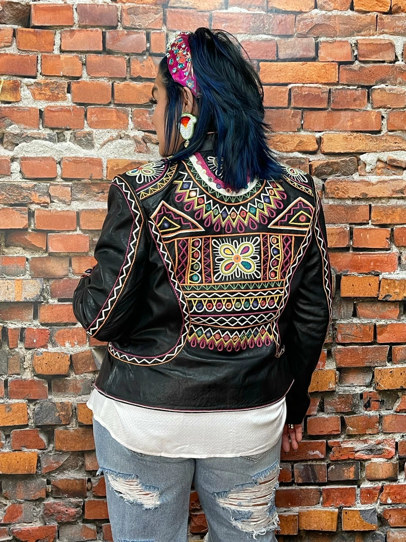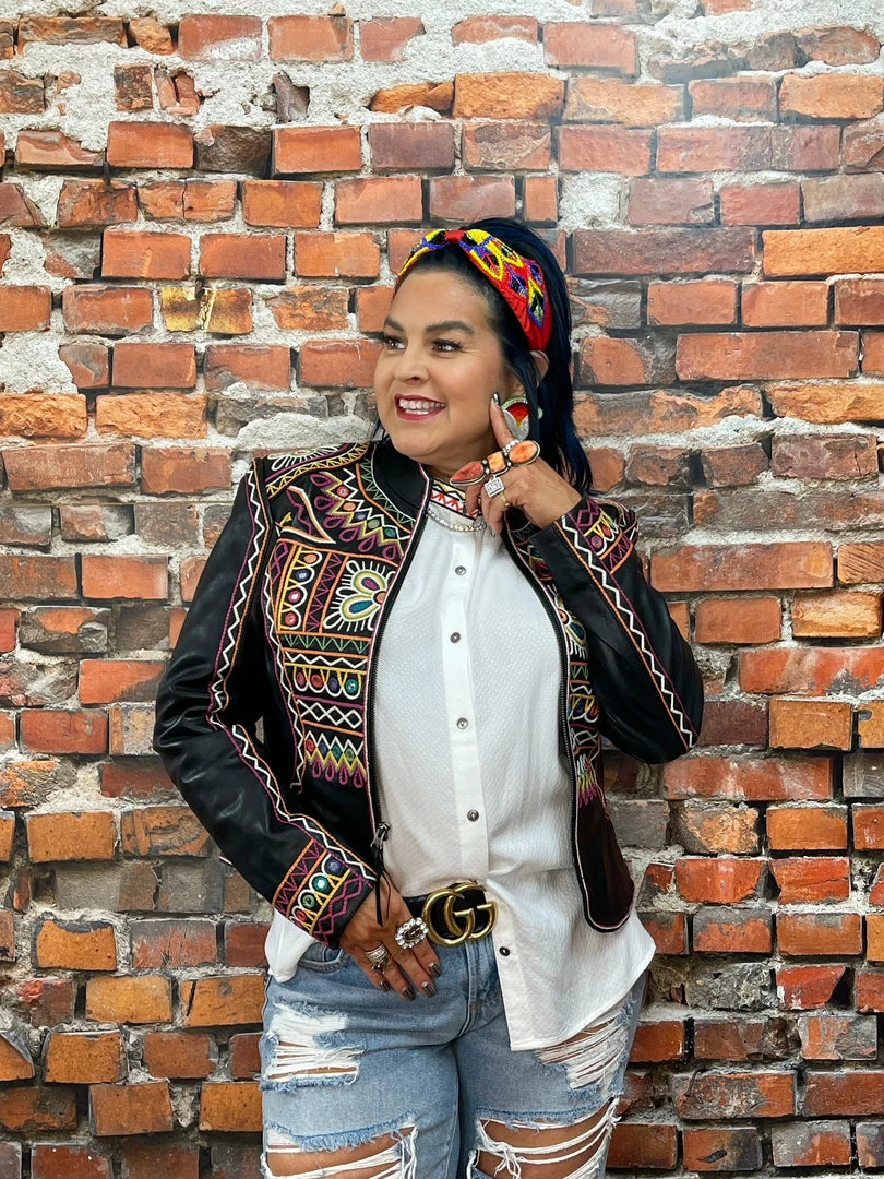 The “Festival of Colors” is an enormous and very vibrant annual celebration in India (that’s actually taking place right about now-ish, March 18th) which involves the tossing, spreading, and smearing of vividly colorful powders, leaving festival-goers covered head-to-toe in lively hues. This jacket incorporates those bright colors as well as intricate geometric embroidery inspired by the folk art aesthetic from that part of the world. You can’t NOT feel joyous in this jacket – it’s like wearing a party!