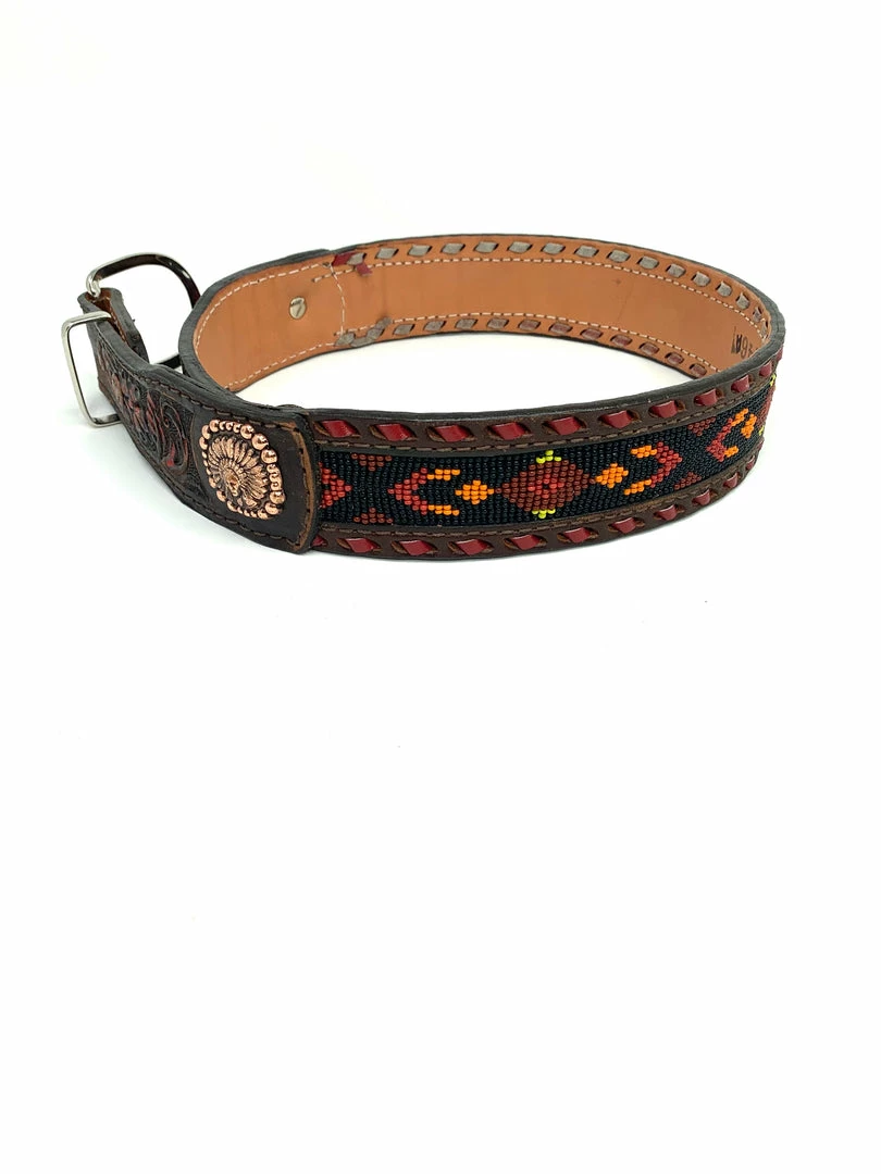 Vintage belt with floral tooled and highlighted ends. Sunset beaded inlay, red buck stitch and antique copper indian head conchos.