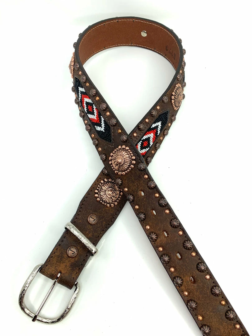 Vintage belt with a beaded inlay. Alternating antique copper engraved dots and small copper dots along the edges Accented with antique copper indian head conchos.