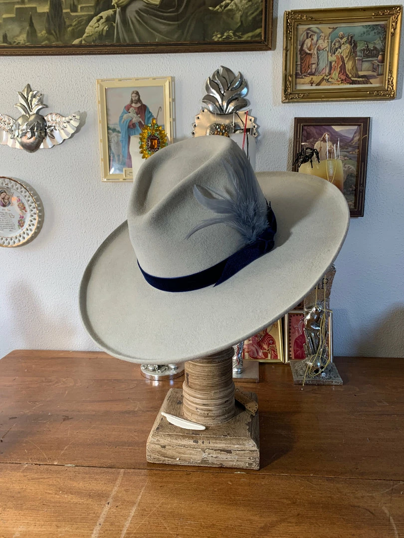 | Color | Silver Belly w/blue velvet ribbon and feathers |