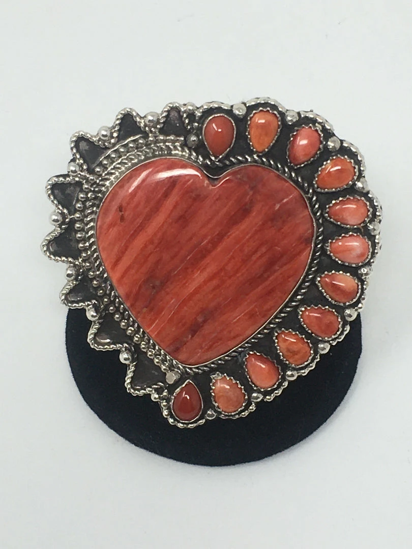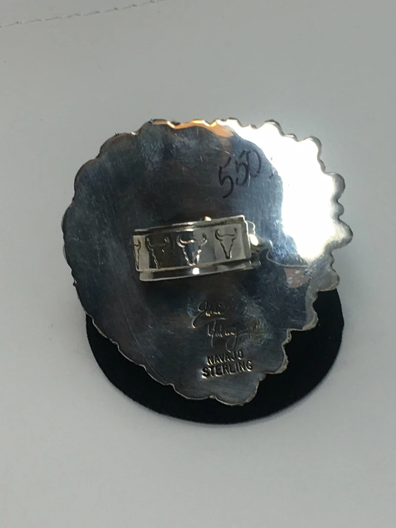Navajo sterling ring with single heart-shaped stone surrounded on one side by 12 smaller tear-drop shaped stones.