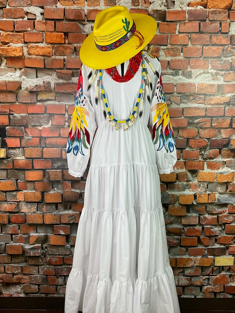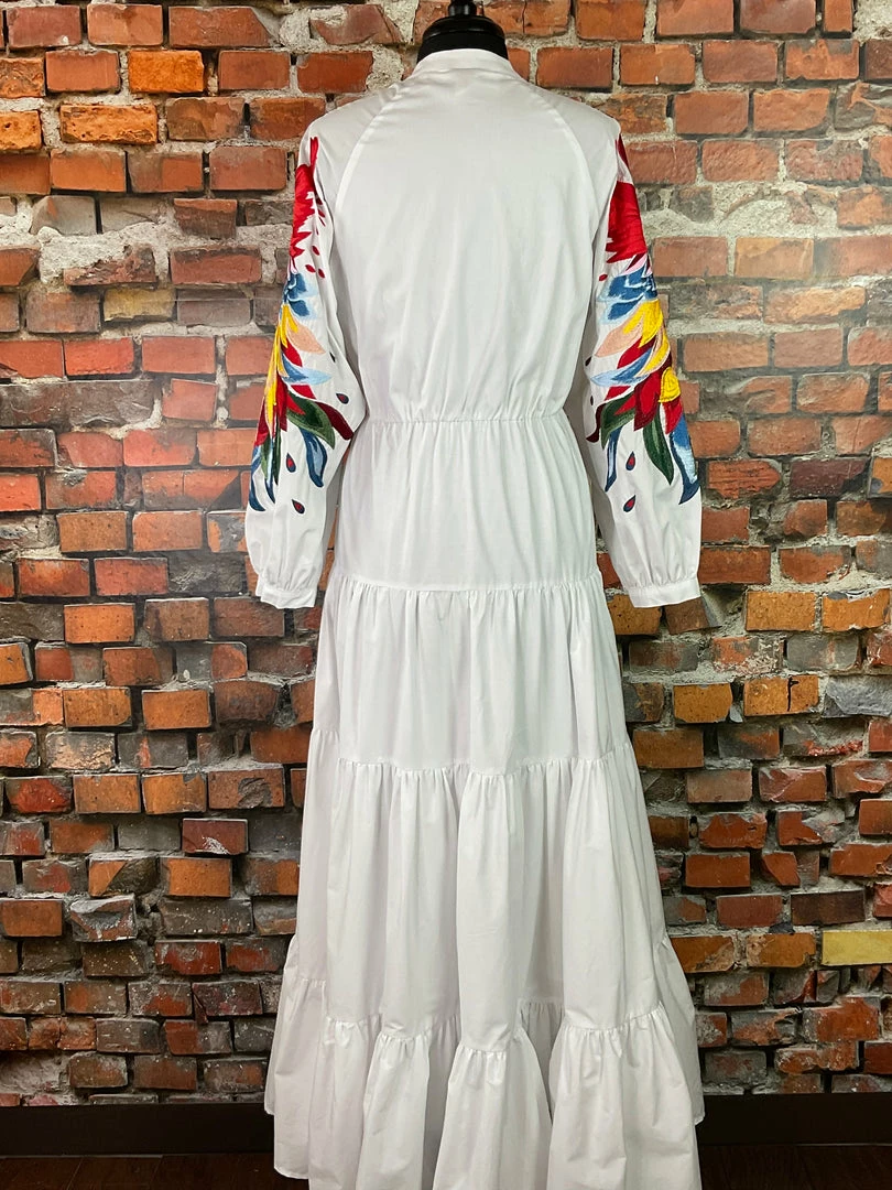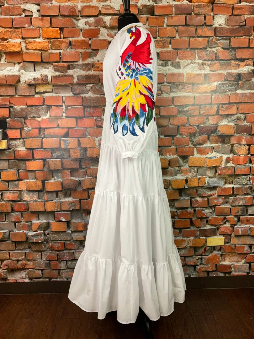 This bold colored embroidered peacock on the sleeves is quite a statement piece!