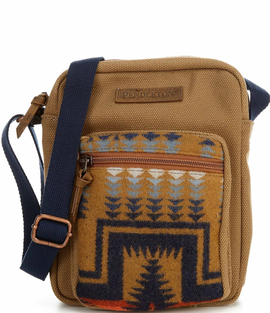 A zippered bag with a roomy interior and a wool jacquard snap pocket on front. Adjustable strap, antiqued copper hardware, leather logo patch. Pattern placement may vary.