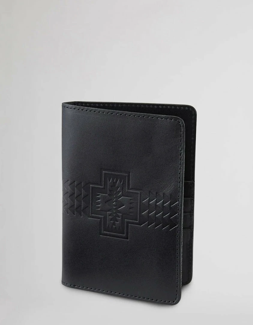 A smart, stylish case crafted of sleek leather with an embossed pattern on front. Inside are multiple slots for passport, cards, receipts and more.
