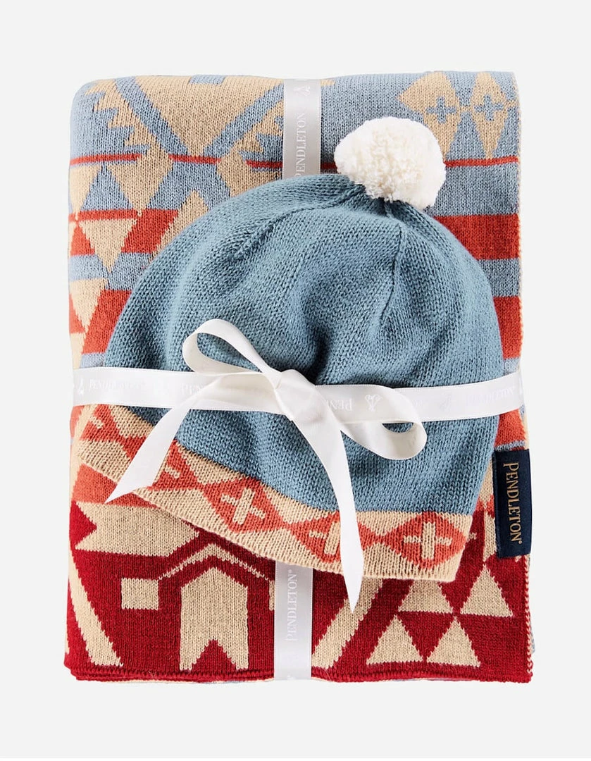 Cuddle your new arrival with this soft, machine-washable cotton knit blanket, with a matching knit beanie for your favorite little head. A lovely, sure-to-be-appreciated gift. Cap fits 6-12 months.