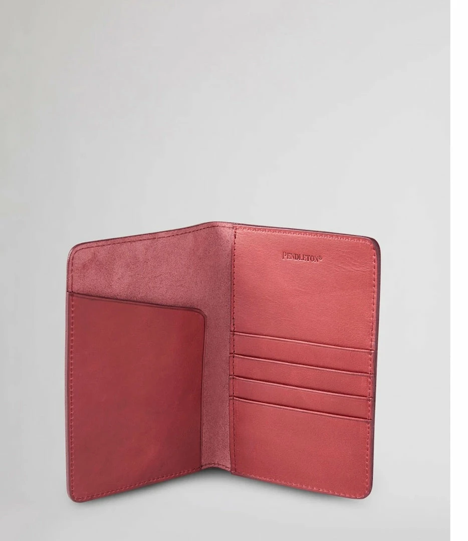 A smart, stylish case crafted of sleek leather with an embossed pattern on front. Inside are multiple slots for passport, cards, receipts and more.