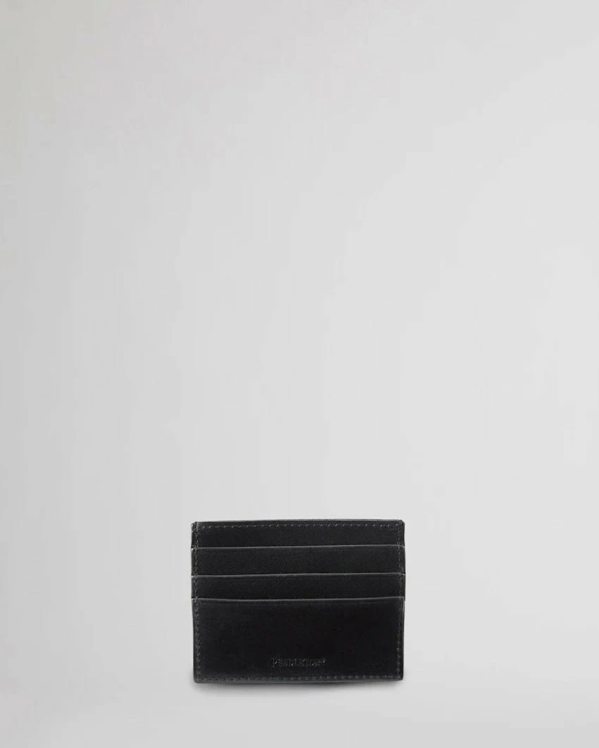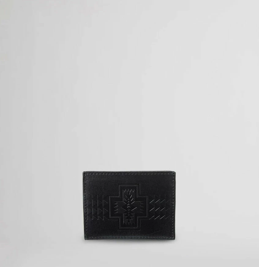 Small enough to fit in a pocket, this sleek leather wallet has an embossed pattern on front and four card slots inside.