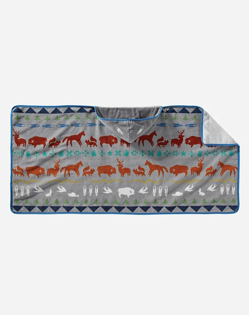 Dry off and cuddle wee ones with a cozy hooded kids’ towel featuring a parade of creatures great and small. Soft, thick cotton.