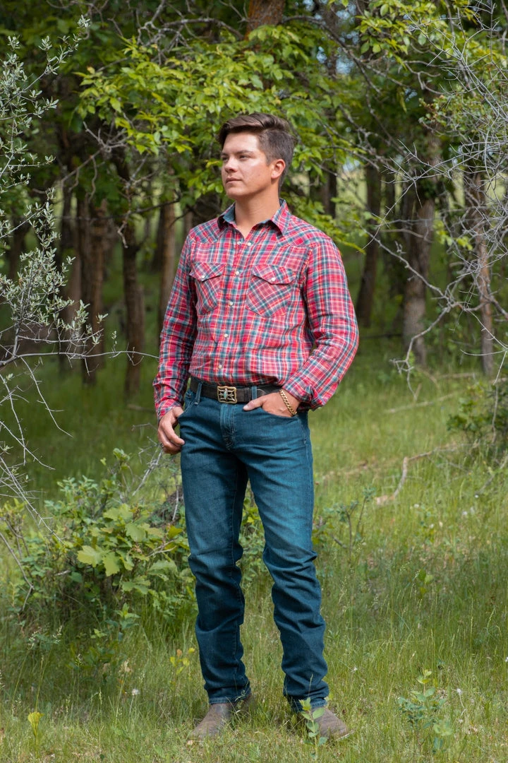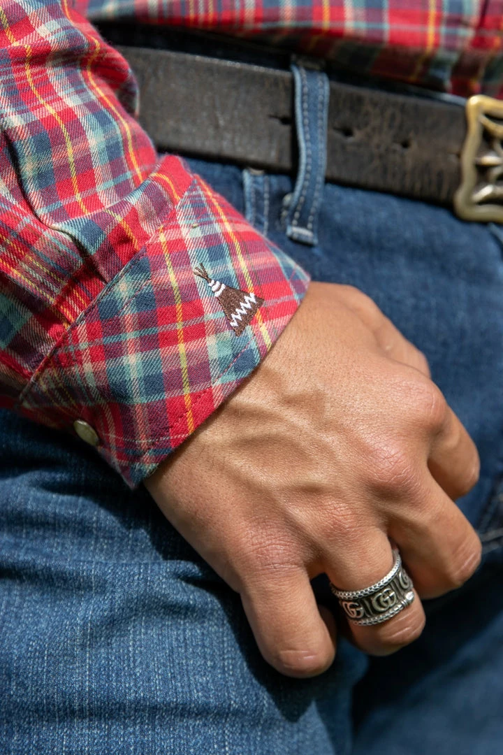 Tasha Polizzi has added a men’s line!!! The Rider Shirt is a Denali plaid shirt with a western yoke in front and back. Denim on inside cuff and TP signature embroidered teepee on the outside of the cuff.