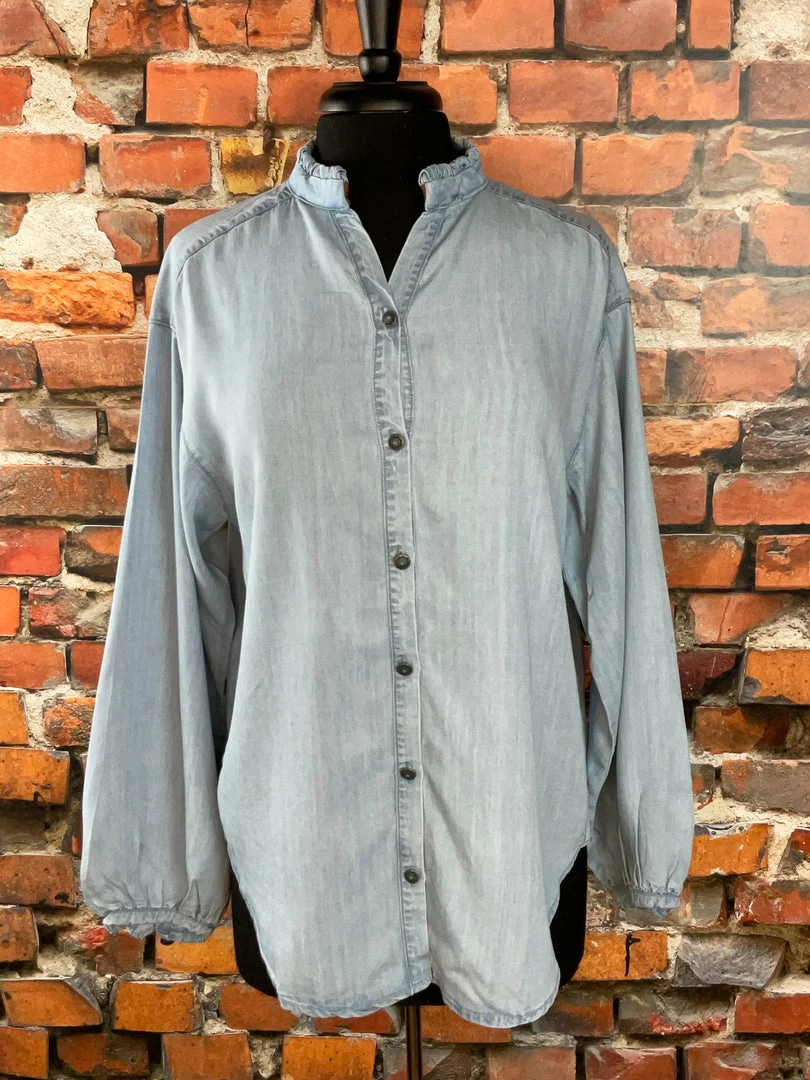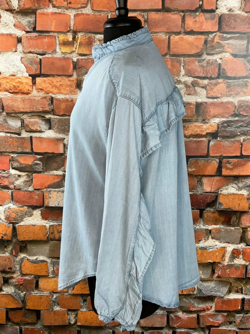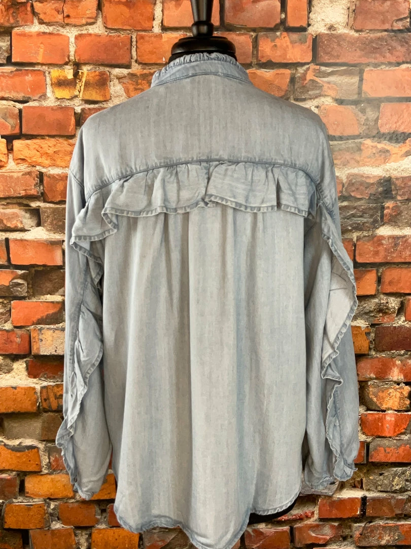 Denim says comfort all the way and the ruffle across the back of the sleeves and back say all girl!ย ย