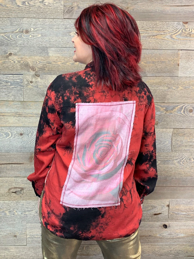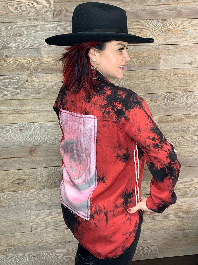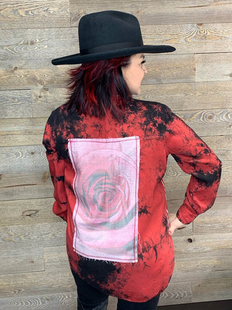 The Valentine is so pretty!! ย It is a button down red & black shirt made of 100% Rayon. It has a stripe down the sides and a fabric rose design on the b๏ฟผ๏ฟผack. Roll up and button sleeves optional.ย