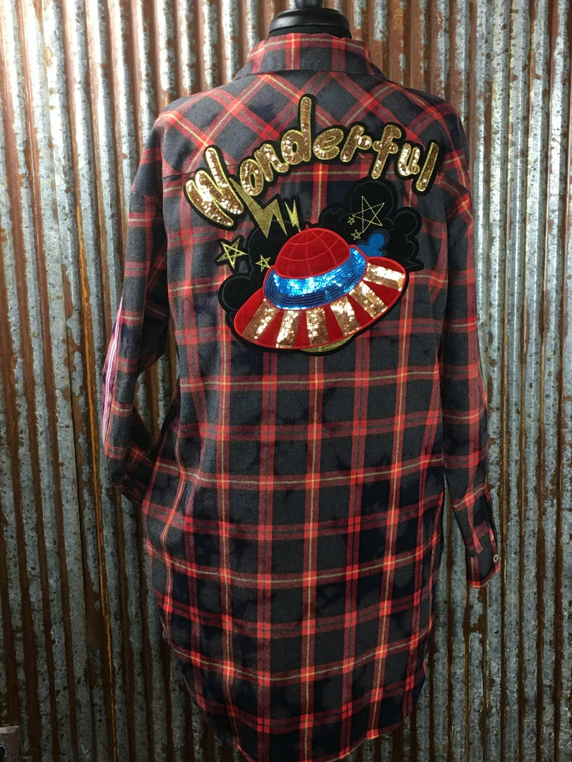 Long sleeve plaid tunic with a “wonderful” sequinned aplique on the back.ย Two breast pockets and two side pockets.ย How could you not feel wonderful in this?