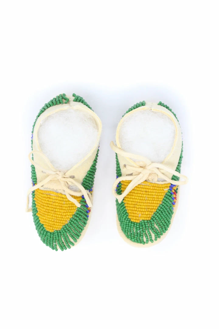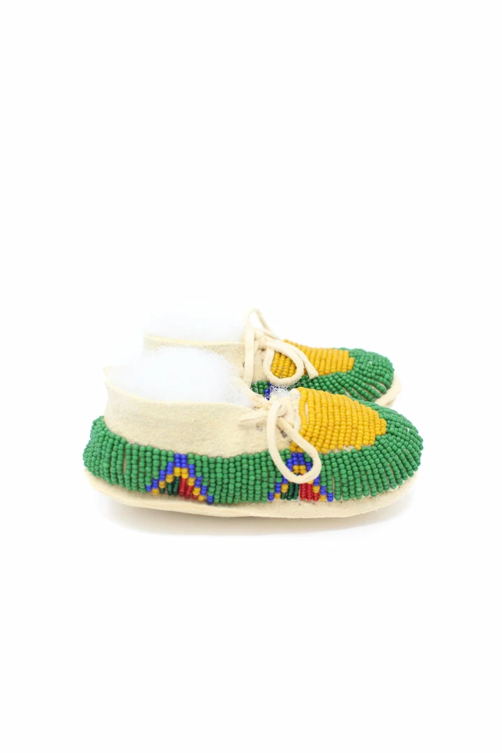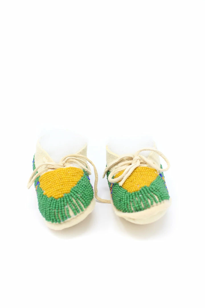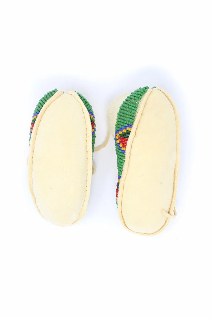 Tanned hide baby moccasins adorned with size 11/0 vintage seedย beads.ย