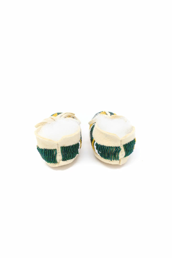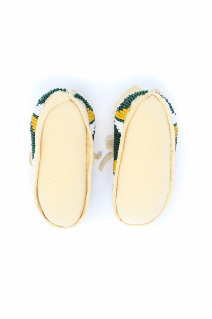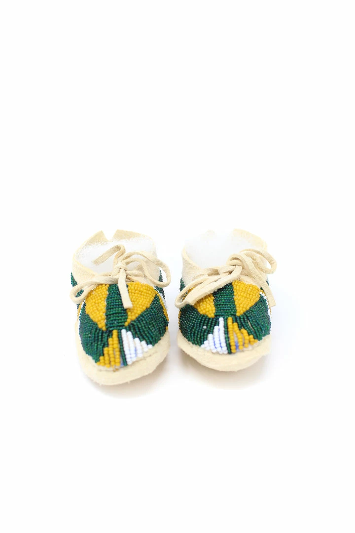 Tanned hide baby moccasins adorned with size 11/0 vintage seed beads.