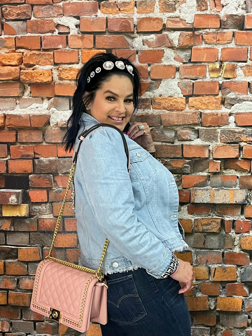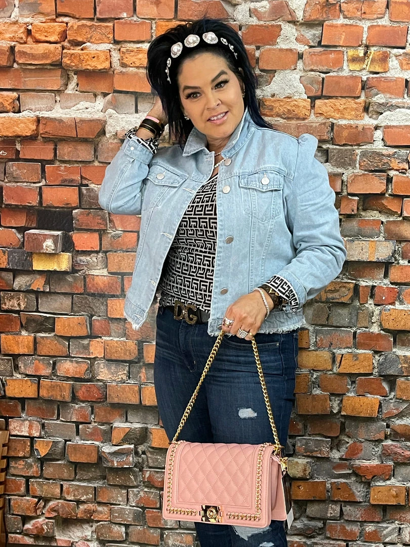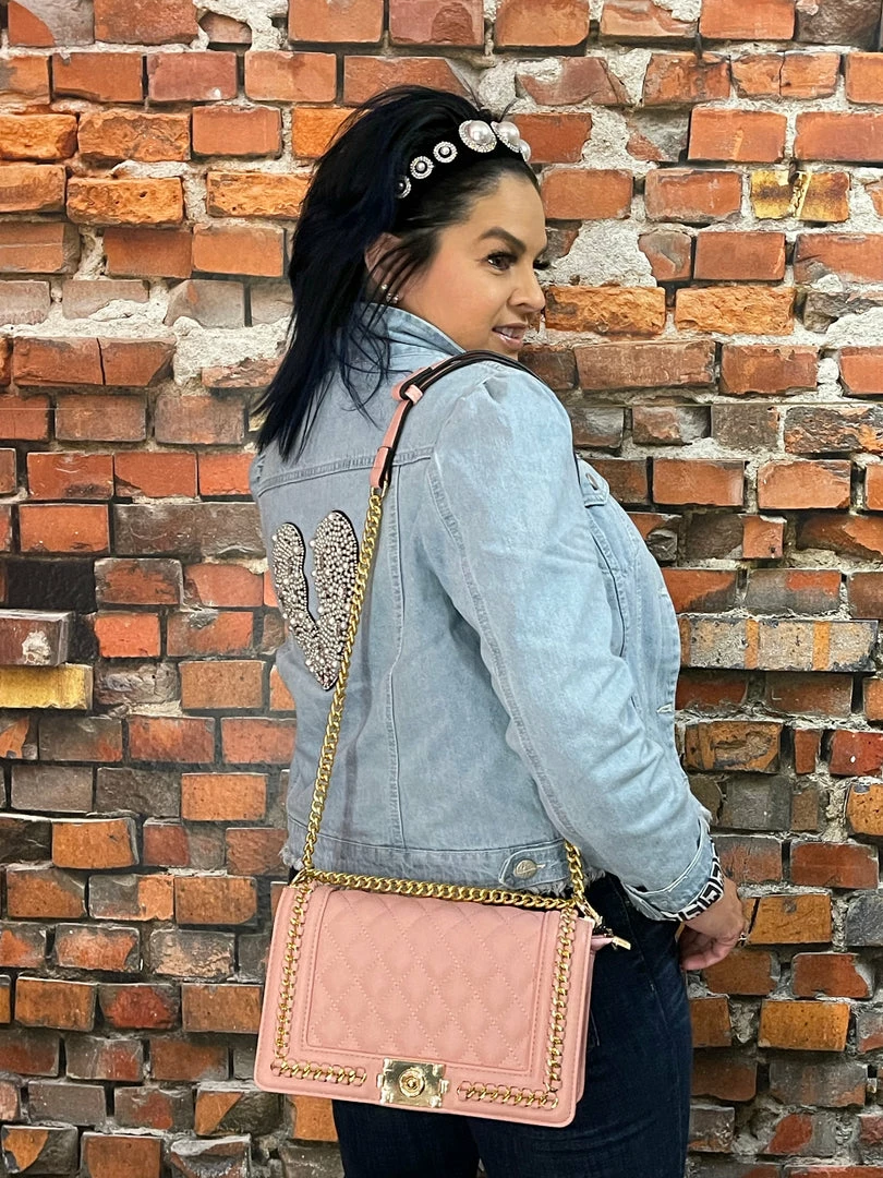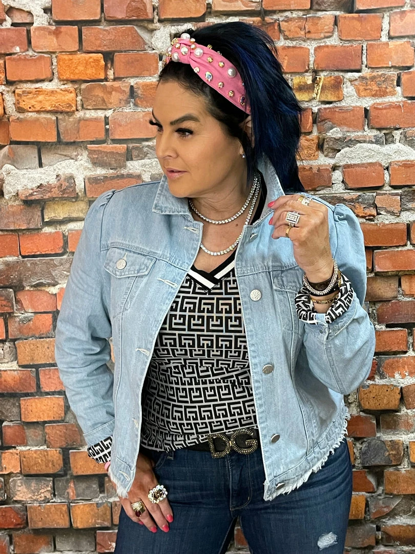 Light Blue Denim Jacket raw edge hem embellished jewel + Pearl broken heart. With an all over designer inspired lining in jacket.