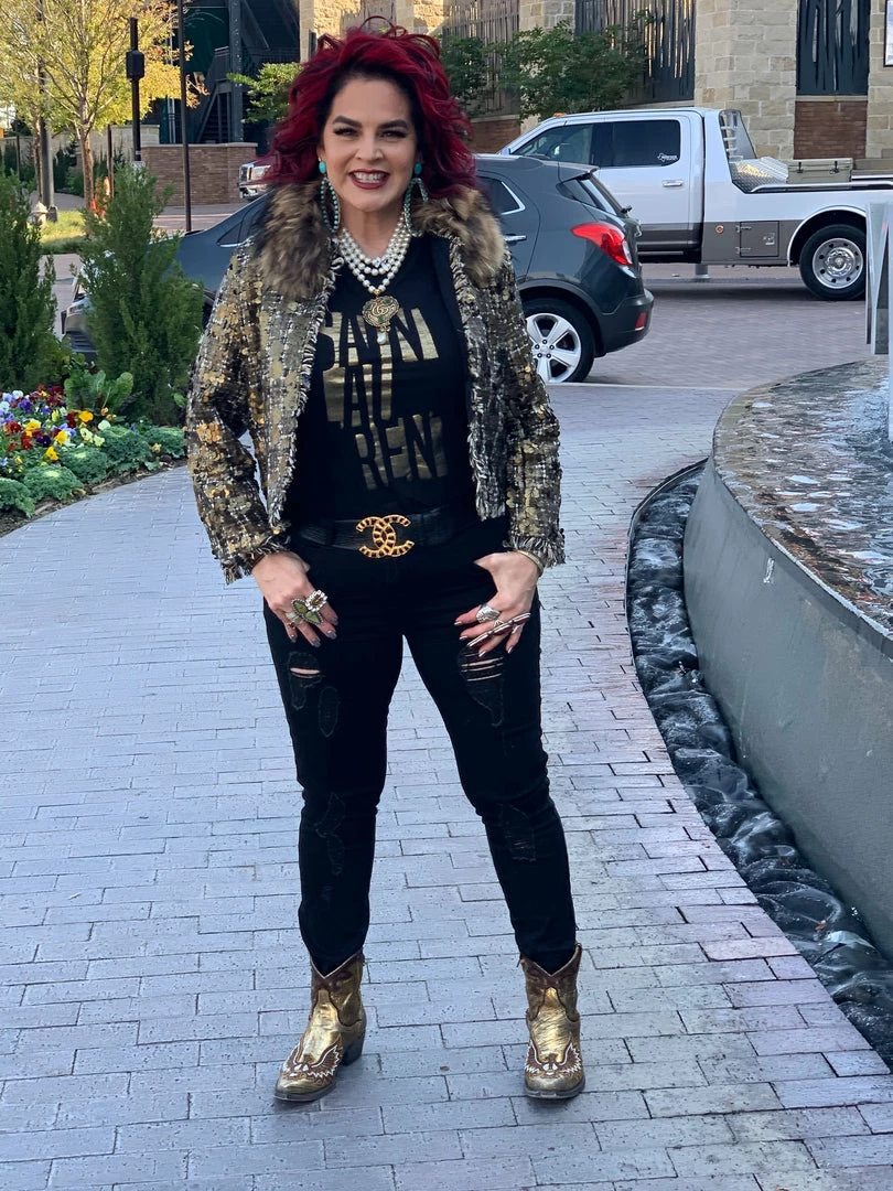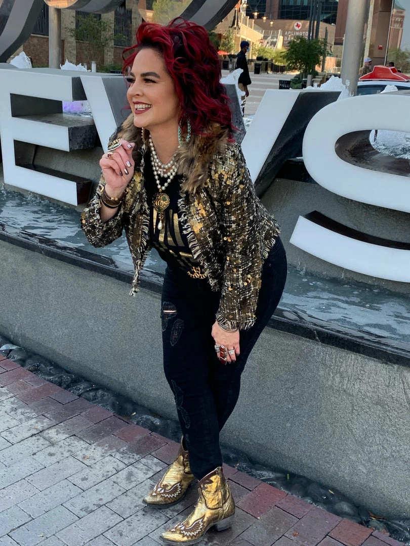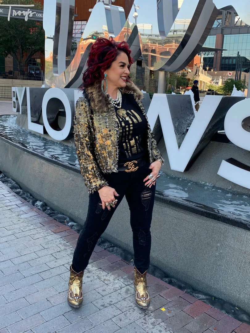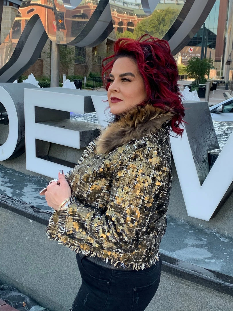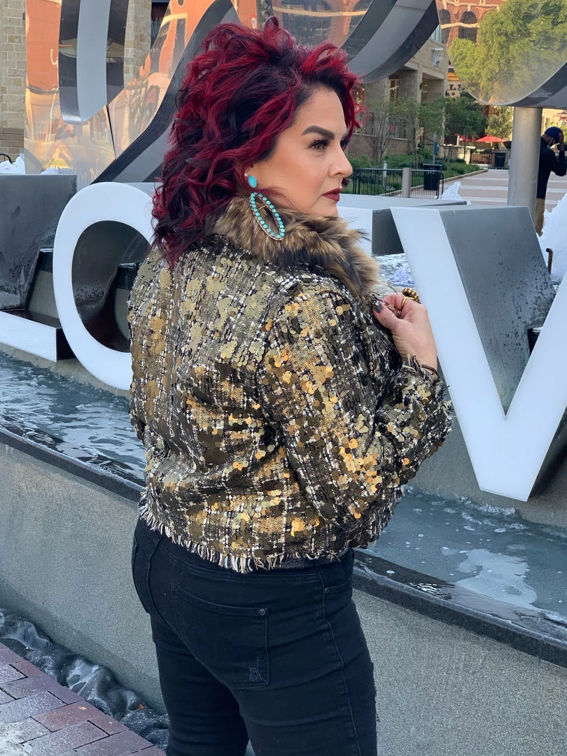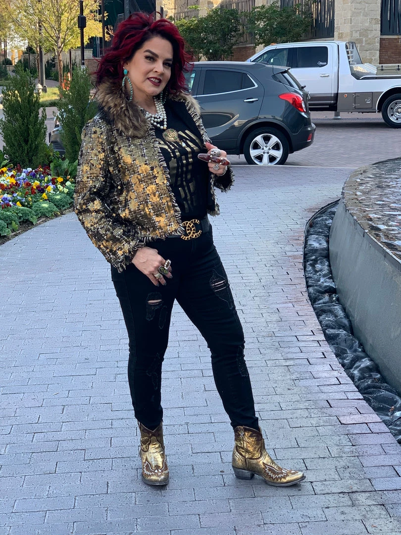 Sometimes all it takes is to put everything together like with this cropped, tweed & sequin jacket with a gold fur collar, and you have a winner!