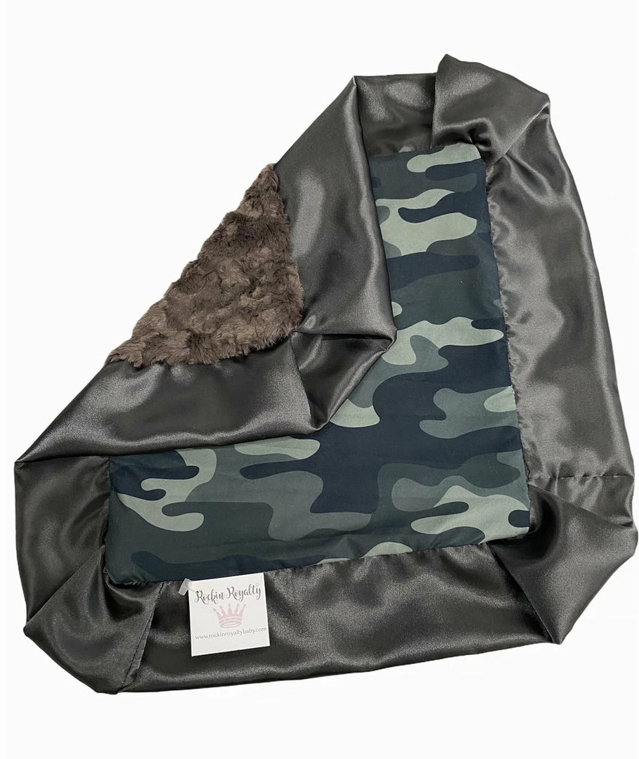 This cuddleΒ lovie includes cute camo print backed with faux fur and is trimmed with a generous satin ruffle that the babies love to snuggle with! Approximately 15″ X 15″.