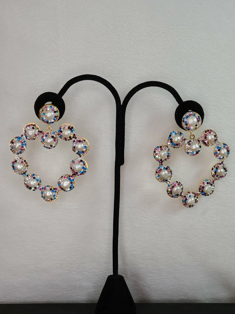 Who wouldn’t want a pair of these beautiful heart shaped earrings?ย Pearls surrounded by tiny shimmering colored stones that are guarenteed to get some attention!ย ย