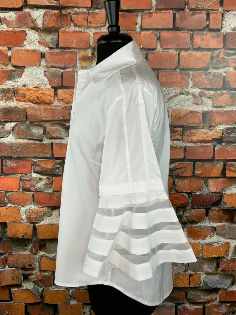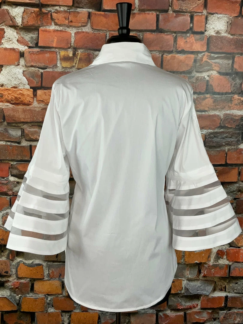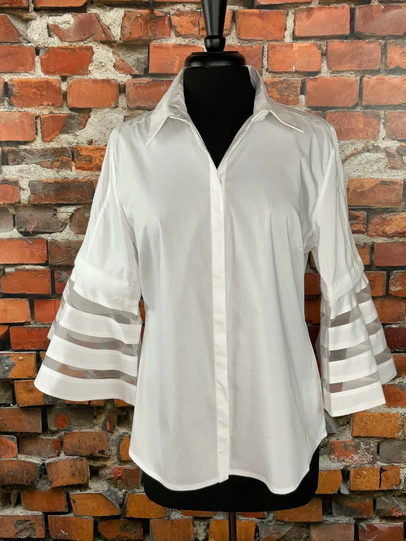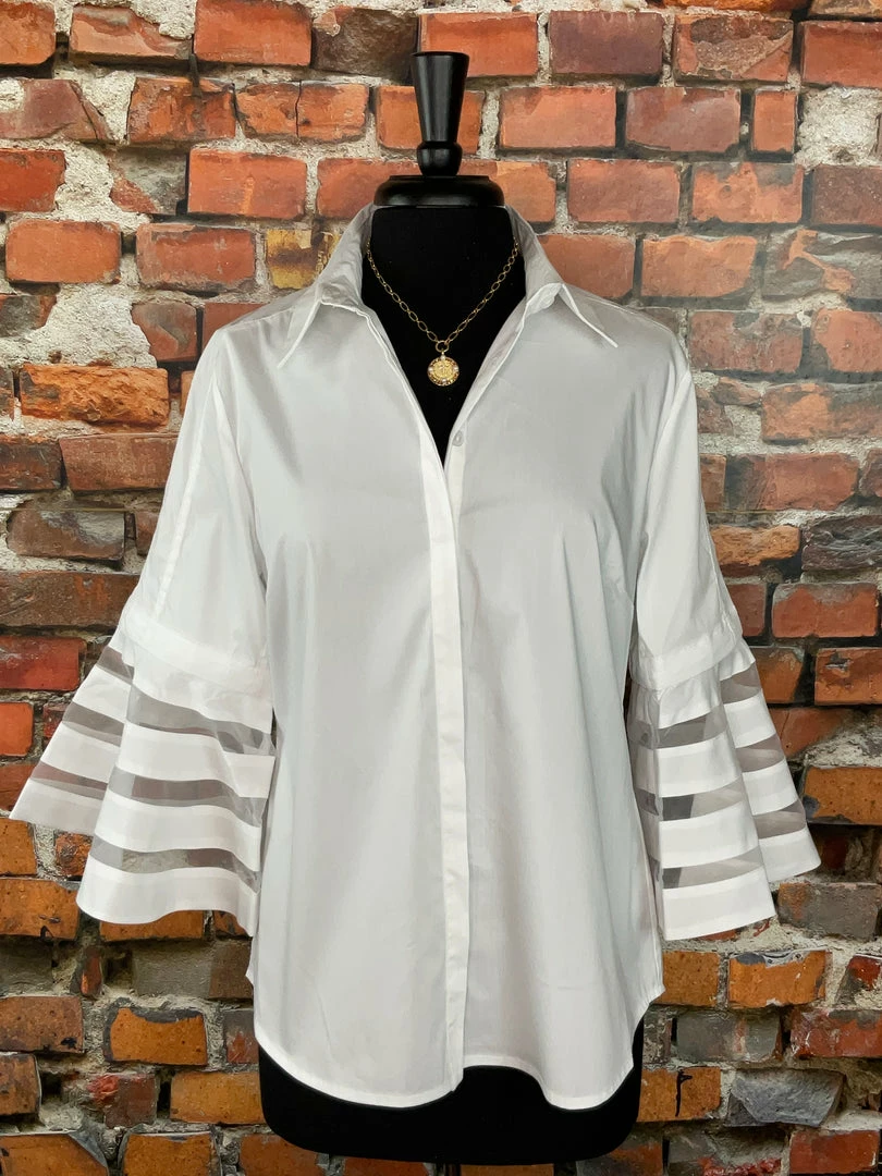 Put some flare in your business white button-up shirt! A little pizazz says you’re going a long way baby! Taylored style gives this medium Tiffiany’s wearing the perfect fit and true to size.