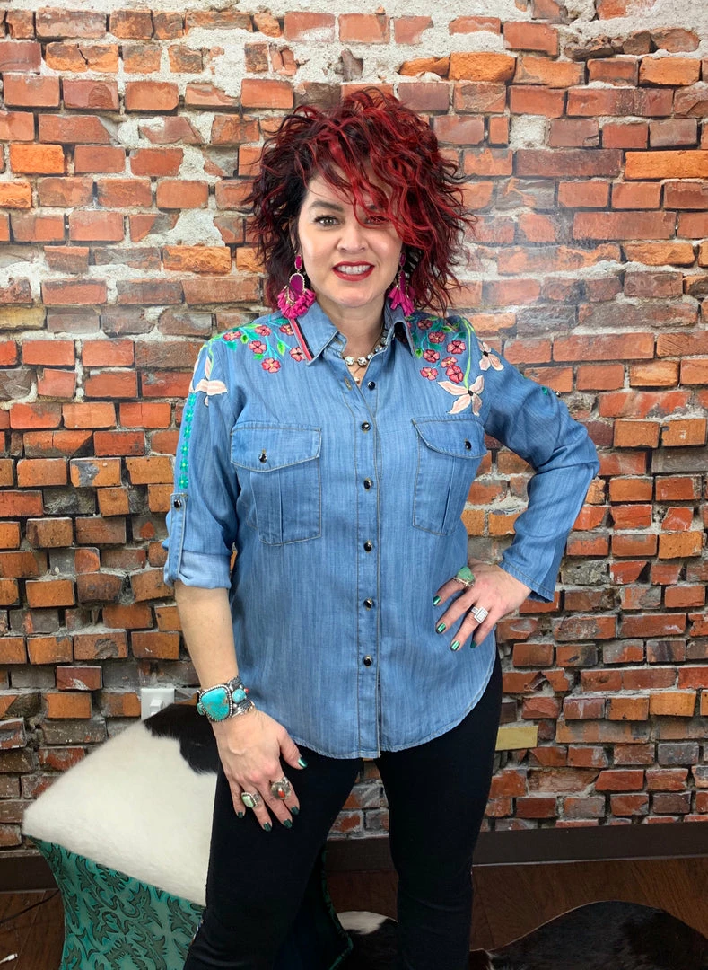 This lovely top features intricate embroidery on soft denim. Fits true to size.ย
