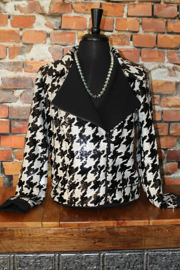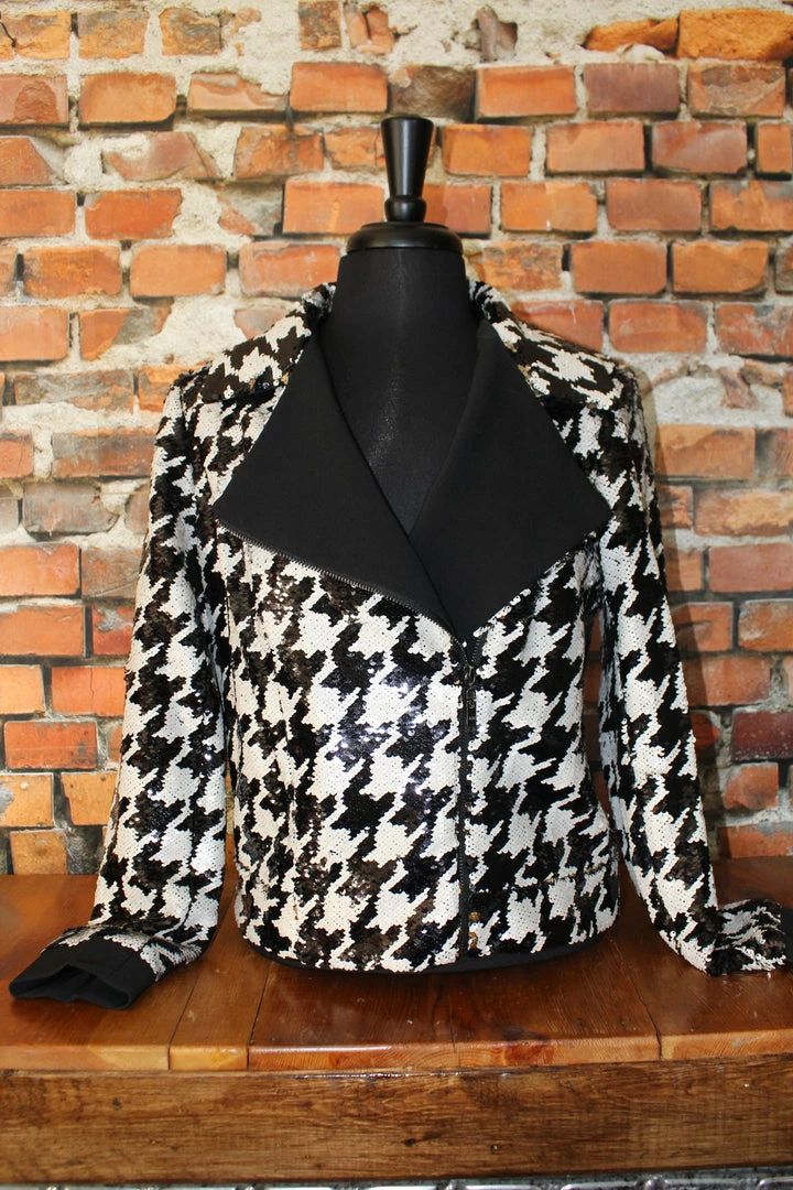 Black & Ivory sequins never looked so good together.ย The pattern and style of this jacket says “smart and sassy” all the way!ย ย