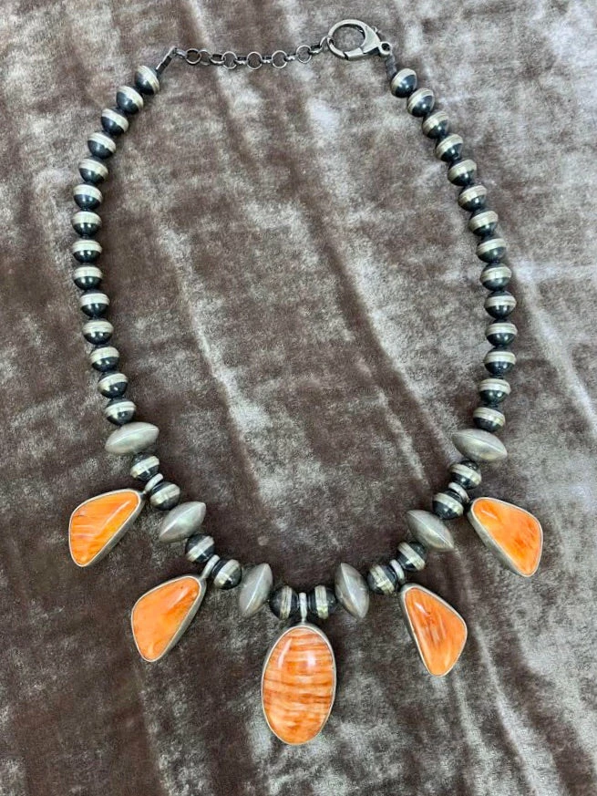 This necklace is even more stunning in person. Featuring 5 spiny oyster cabs strung along with Navajo pearls.Β