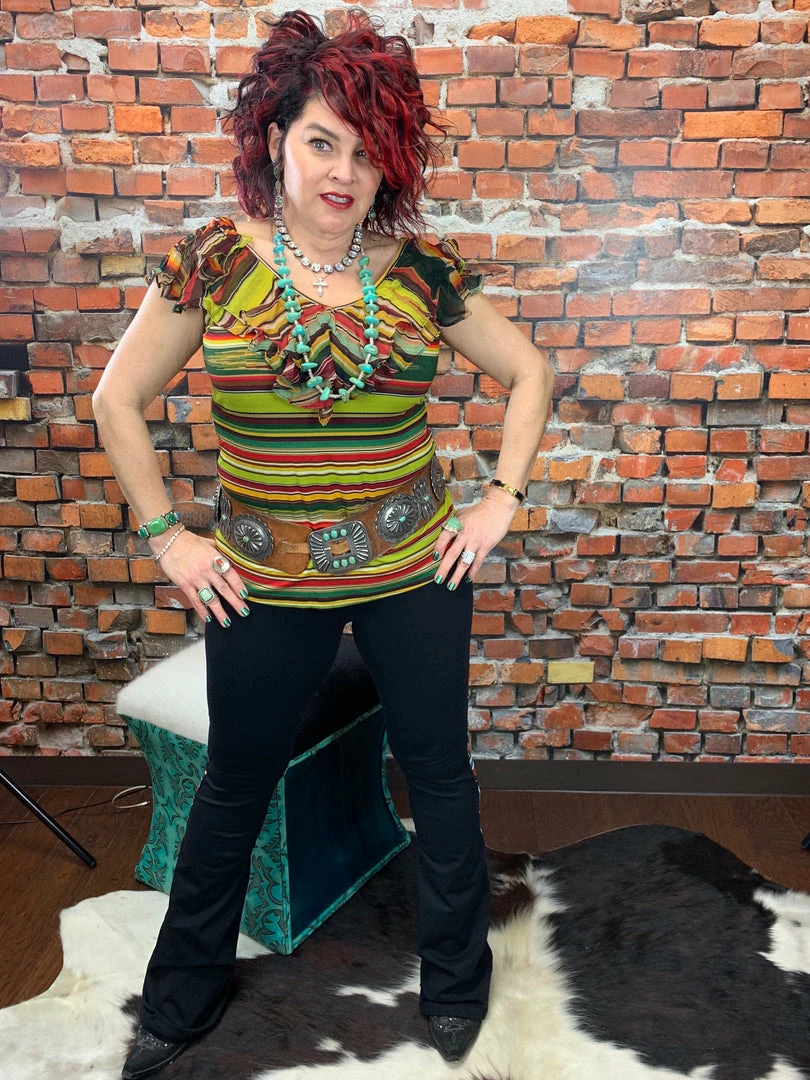 This Vintage Collection top features a serape earth green print with a flutter sleeve neckline. Talk about flattering!